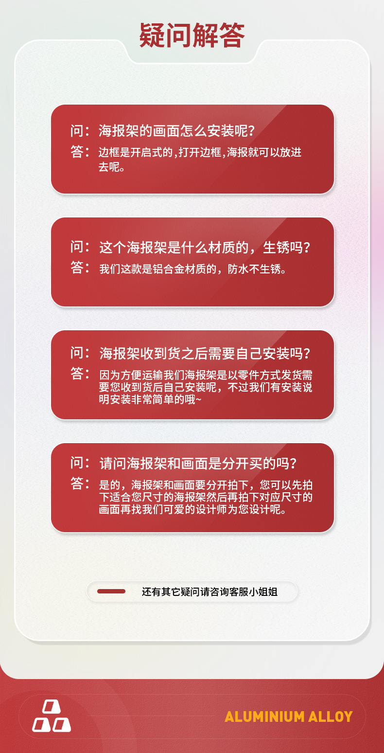 5.海报架塑封包装拆封后,不予退换!雪弗板属于按照具体尺寸切割定制类产品 一经售出 不予退换!