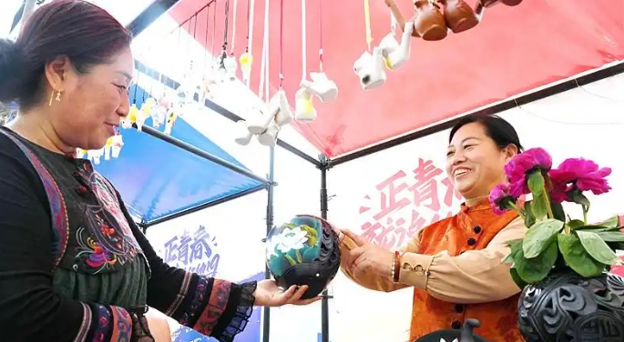 4月8日,第四届雄安·雄州文化艺术节非遗正青春·文创非遗展区内,雄安新区非物质文化遗产代表性传承项目黑陶烧制技艺展位前,工作人员向游客展示黑陶作品。 河北日报记者刘光昱摄